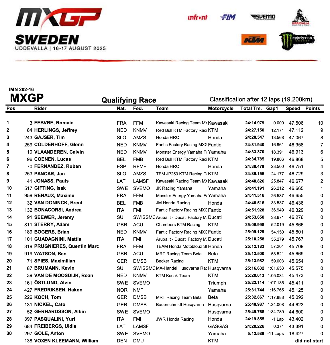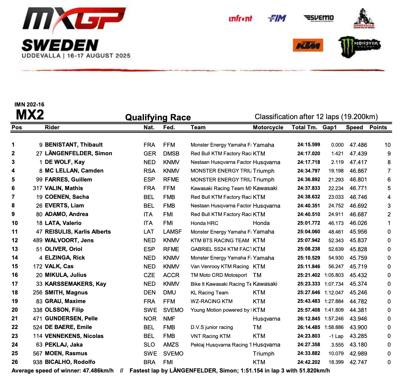 MX2 – Qualifying Race – Classification