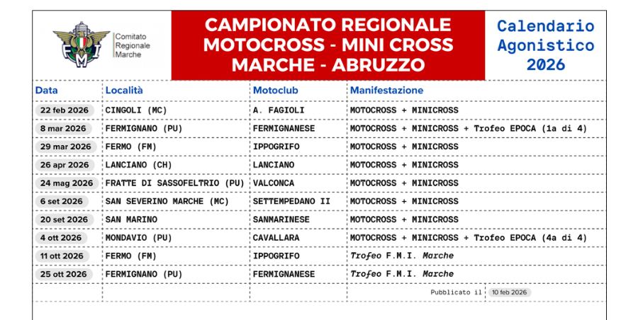 E’ stato reso noto il calendario del Regionale motocross di Marche-Abruzzo. 8 prove che si svilupperanno da Febbraio ad Ottobre, il debutto a Cingoli il 22 Febbraio.