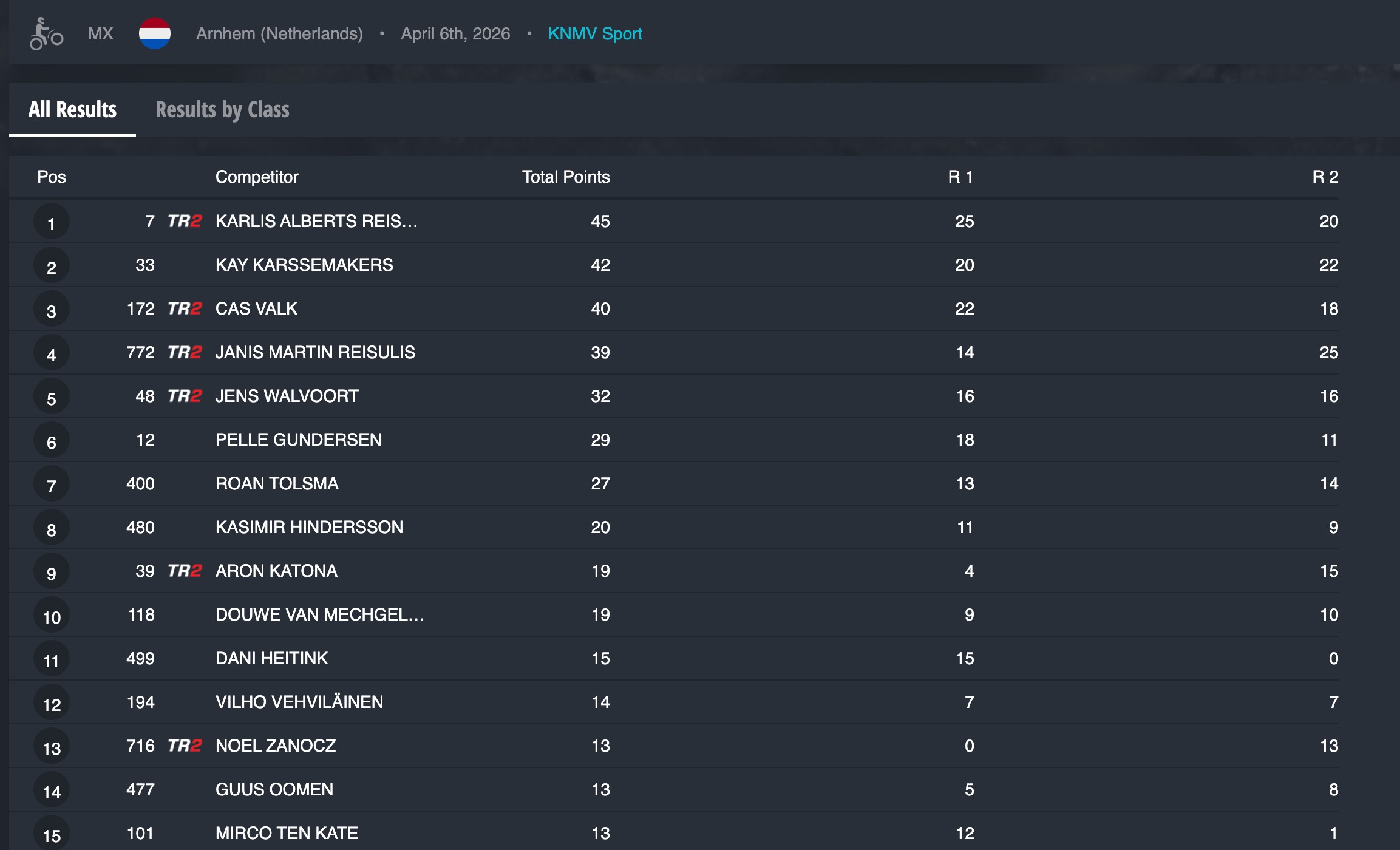 “Solo” quarto Janis Reisulis incappato in una prima manche complicata, in gara due al contrario ha fatto vedere le sue capacità sbaragliando la concorrenza. Per lui il 4° posto assoluto, al 5° posto un altro pilota del mondiale, Walvoort.