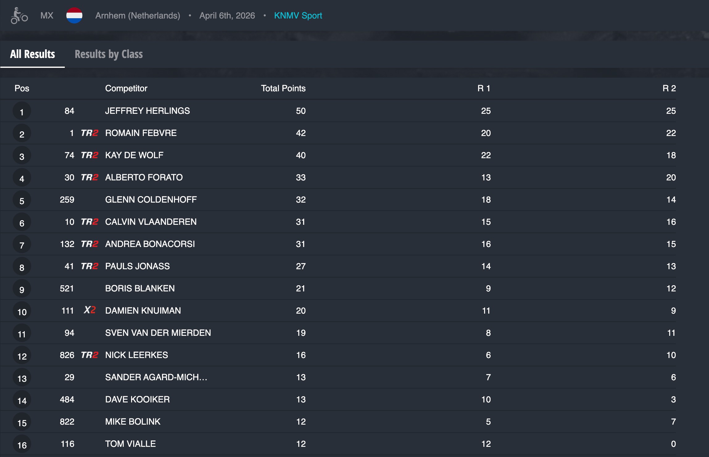 Doppietta per Jeffrey Herlings che ha dovuto tenere a bada specialmente in gara uno Kay de Wolf, mentre nella seconda manche ha fatto la differenza andando a vincere su Febvre ed il nostro Alberto Forato.