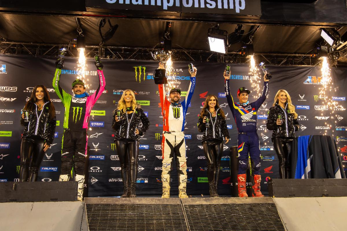 Podio della classe 450SX (piloti da sinistra a destra) Jason Anderson, Eli Tomac e Chase Sexton. Credito fotografico: Feld Entertainment, Inc.