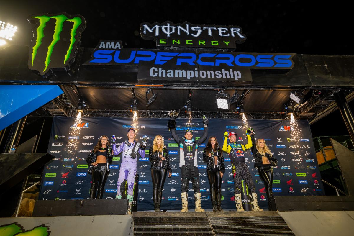 Jason Anderson del team Monster Energy Kawasaki ha guidato all’inizio la gara ed è stato vicino a Tomac alla fine, ma si è accontentato del secondo posto all’arrivo. Classe 450SX al secondo anno Chase Sexton del Team Honda HRC ha confermato la sua prima vittoria in carriera nella Classe 450SX con un podio alla seconda tappa della serie ad Anaheim. È stato un emozionante Main Event nella Western Regional 250SX Class, con Christian Craig della Monster Energy Star Racing Yamaha che ha ottenuto la sua terza vittoria della stagione dopo una battaglia durata una gara che ha mantenuto la vittoria incerta fino alla fine.
