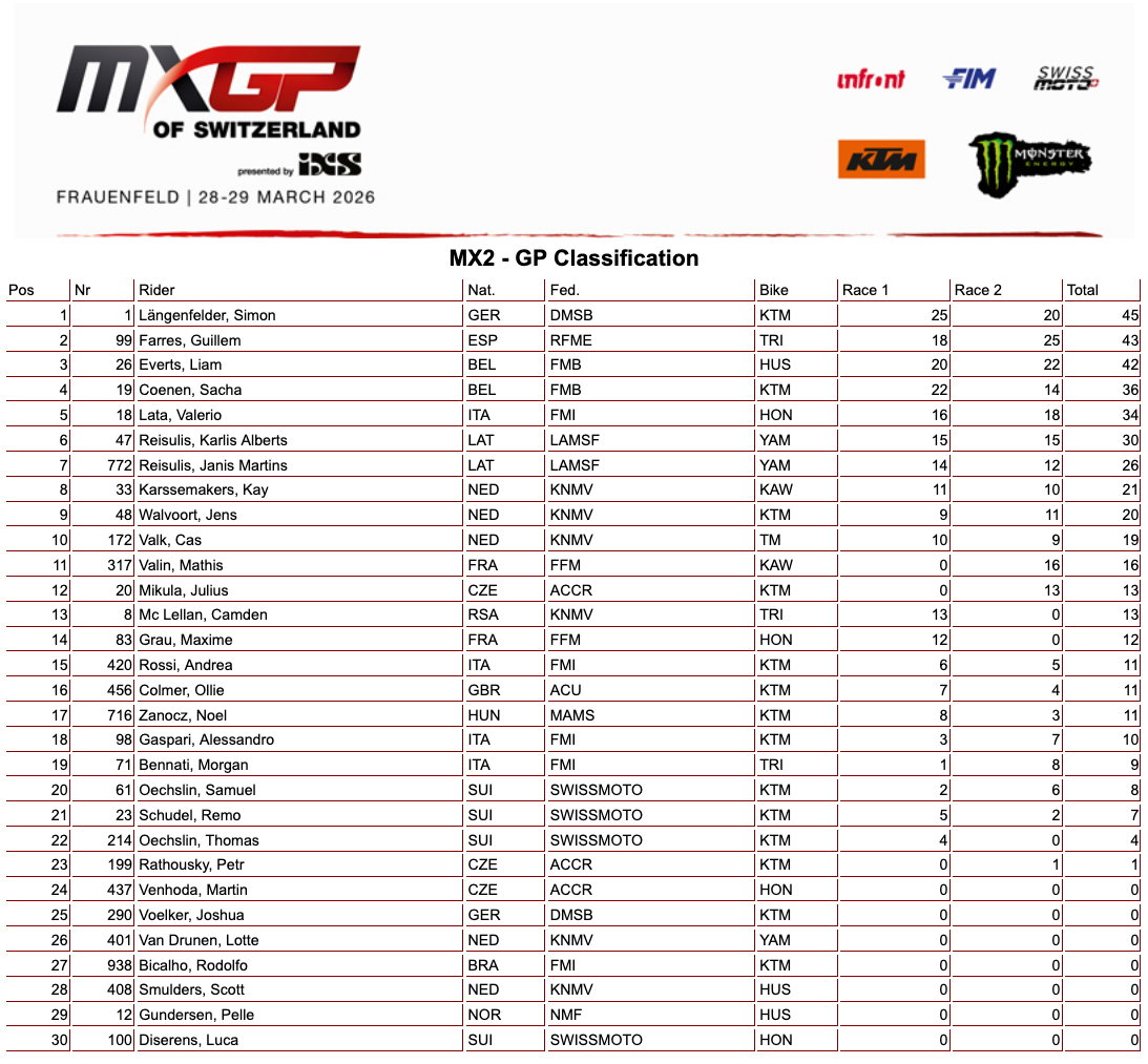 MX2 – GP Classification-Svizzera
