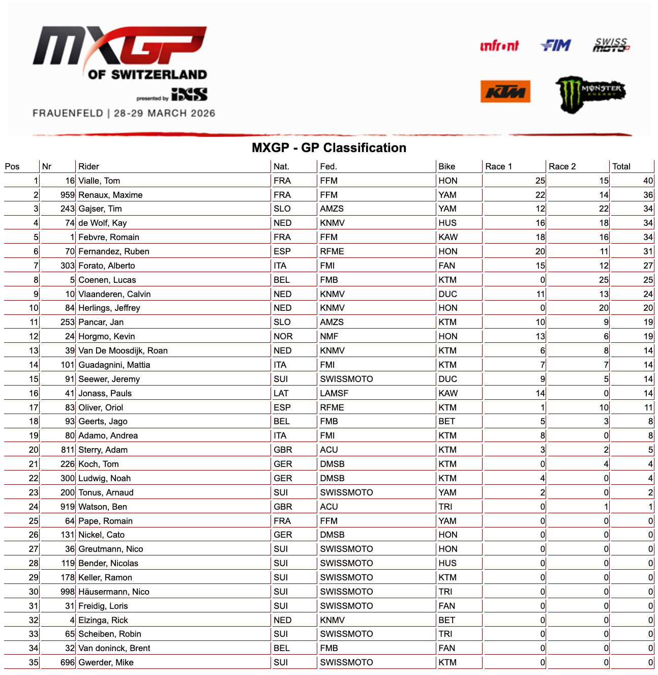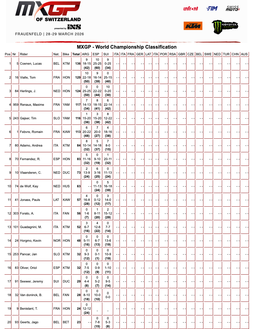 Un GP dai tanti colpi di scena quello appena terminato in Svizzera a Frauenfeld. La terza gara della stagione ha visto un cambio al vertice della MX2, col campione del Mondo Langenfelder tornare primo e una MXGP con Vialle primo e Lucas Coenen ancora tabella rossa nonostante lo zero di gara-1.