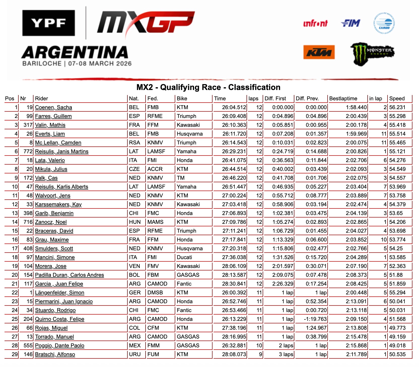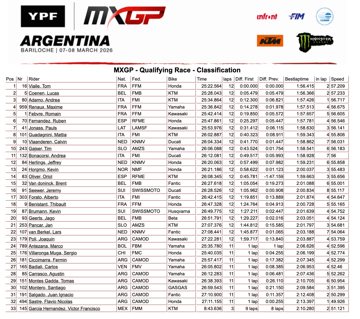 Bariloche – Con un piglio da vero campione Tom Vialle guida la manche di qualifica della MXGP dalla prima curva fino al traguardo. A punti Adamo 3° e Guadagnini 8°. Sacha Coenen ha dovuto vincere la resistenza di Janis Reisulis prima di fare il vuoto dietro di se. 7° posto per Valerio Lata.