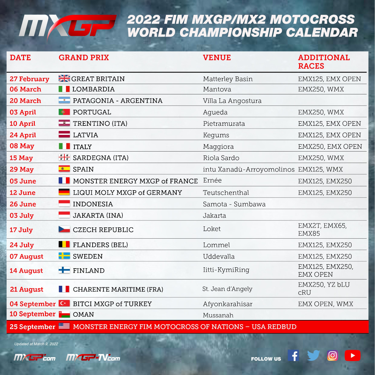 MONACO (Principato di Monaco) 11 marzo 2022 – Infront Moto Racing informa su alcuni aggiornamenti che sono stati apportati al calendario gare 2022 del Campionato Mondiale FIM Motocross.