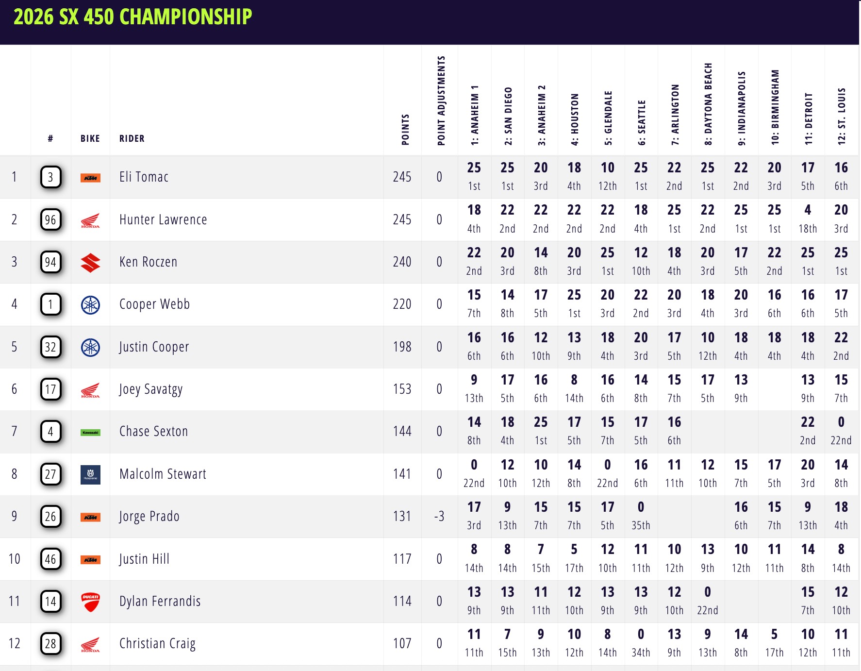 Lawrence ha riguadagnato una quota della testa della classifica con Tomac, mentre Roczen si è portato a cinque punti dal comando a cinque gare dalla fine. Ken Roczen di Progressive Insurance Cycle Gear Suzuki si è portato a cinque punti dalla testa del campionato dopo le vittorie consecutive.