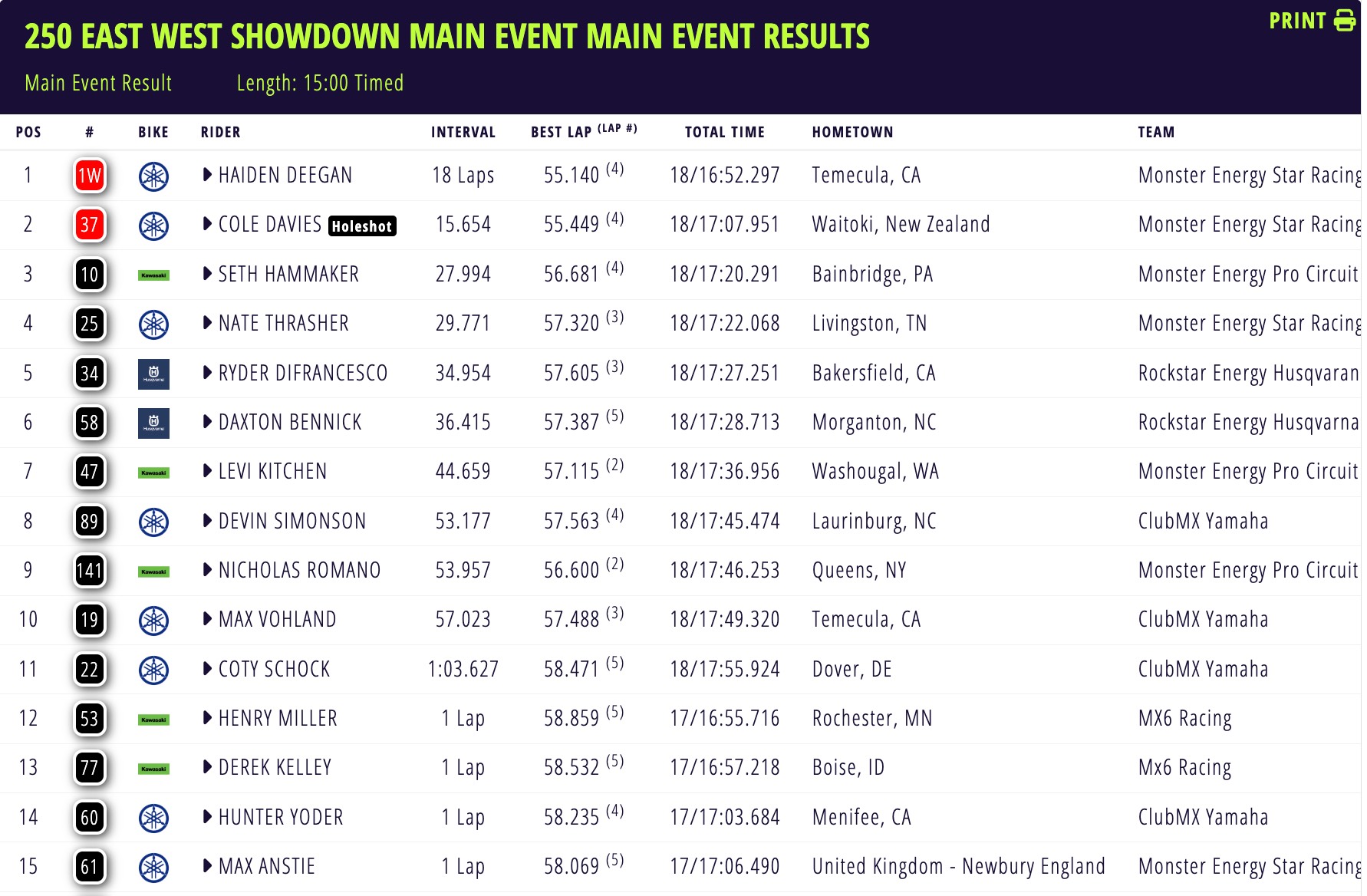 Poco più di tre secondi separavano la coppia Yamaha, ma Deegan ha recuperato il suo deficit e presto ha effettuato un rapido sorpasso su Davies per prendere il comando a poco più di nove minuti dalla fine. Deegan ha aperto un margine di oltre 15 secondi sul campo e ha raggiunto la sua sesta vittoria della stagione con 15,6 secondi su Davies, che non è mai stato sfidato al secondo posto. Hammaker ha ottenuto un tranquillo quinto podio consecutivo, terzo. La vittoria più dominante della stagione per Deegan, combinata con un 15° posto per Anstie, è stata più che sufficiente per concludere il Western Divisional Championship.