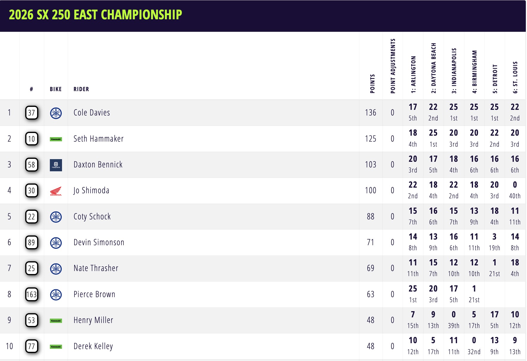 È il sesto titolo in carriera per Deegan e dà il tocco finale a una delle carriere della Classe 250SMX più decorate di tutti i tempi. Davies, nel frattempo, ha aumentato il suo vantaggio su Hammaker nella lotta per il titolo della Eastern Division, con 11 punti che ora separano i due a quattro gare dalla fine. Haiden Deegan di Monster Energy Yamaha Star Racing ha conquistato il secondo titolo consecutivo della divisione occidentale con una vittoria dominante nell’East/West Showdown.