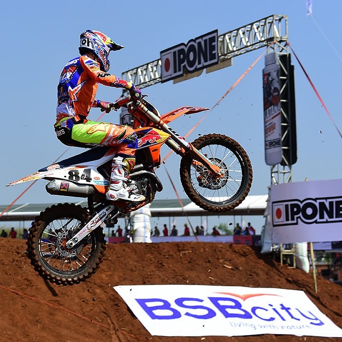 Tony Cairoli ha corso sofferente per via dell’infortunio di una settimana fa nell’MXGP di Indonesia, dove si è procurato una sublussazione del pollice oggi ha corso con due infiltrazioni per evitare il dolore. Nella prima manche è scattato in testa, ma subito Tim Gajser lo ha sopravanzato. Per quasi metà gara è rimasto in seconda posizione fino a quando Herlings ha operato il passaggio decisivo e così Tony ha pensato di mantenere la terza piazza fino all’arrivo. La seconda manche è stata più difficile, infatti dopo l’ennesimo holeshot è stato ostacolato da Herlings che gli ha fatto perdere diverse posizioni, poi il dolore al pollice si è fatto sentire nella prima parte di gara ed è indietreggiato fino all’ottava posizione, poi nel prosieguo delle gara ha stretto i denti ed è tornato a girare con un buon passo fino ad arrivare al quarto posto e quarto nell’assoluta di giornata.