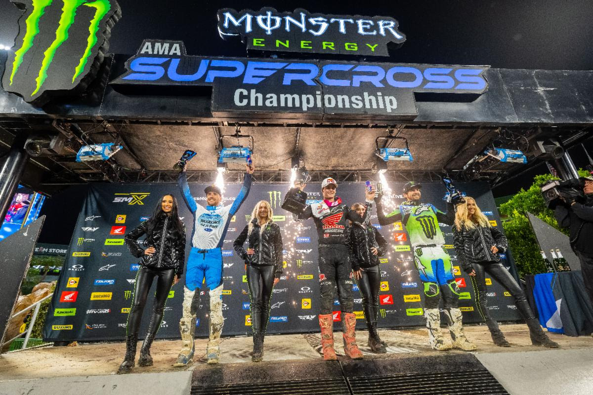 Podio della classe 450SX (piloti da sinistra a destra) Ken Roczen, Jett Lawrence e Jason Anderson. Credito fotografico: Feld Motor Sports, Inc.