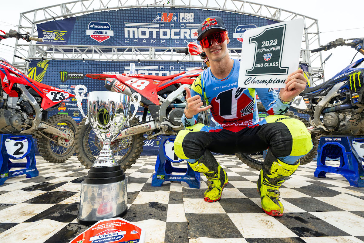 Jett Lawrence è il campione della classe 2023 Pro Motocross 450 dopo l’estensione della sua stagione perfetta con le vittorie in moto 17 e 18 e la sua nona vittoria assoluta.