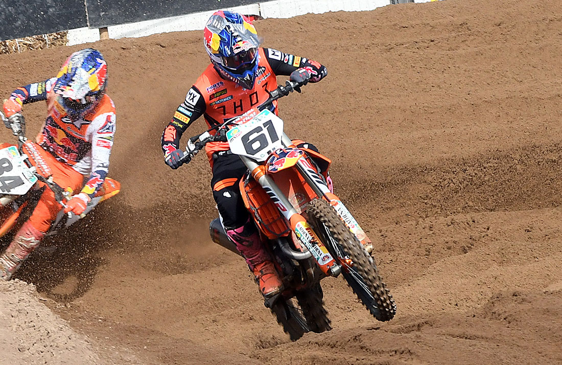 Per Jorge Prado (Red Bull KTM Factory Racing MXGP ) sulla pista sarda è arrivato il quarto podio stagionale: in gara uno si è accodato al fuggitivo Herlings, autore dell’holeshot, e ha raccolto la seconda posizione. In gara due splendida partenza di Prado che si è portato subito in testa alla corsa, ma ha presto dovuto lottare con Herlings, fino a metà manche, quando l’olandese è passato prima. Jorge ha comunque tenuto in scioltezza la seconda posizione che lo ha portato sul secondo gradino del podio, davanti al francese Romain Febvre (Kawasaki). Il ventenne spagnolo è quarto in classifica a soli dodici punti da Herlings. Cairoli resta quinto nonostante il doppio zero.