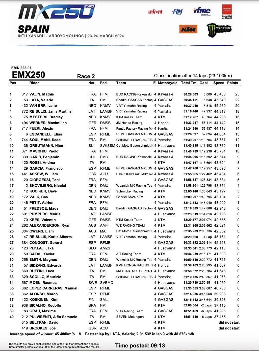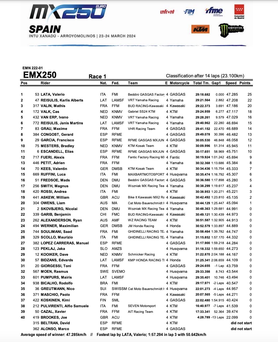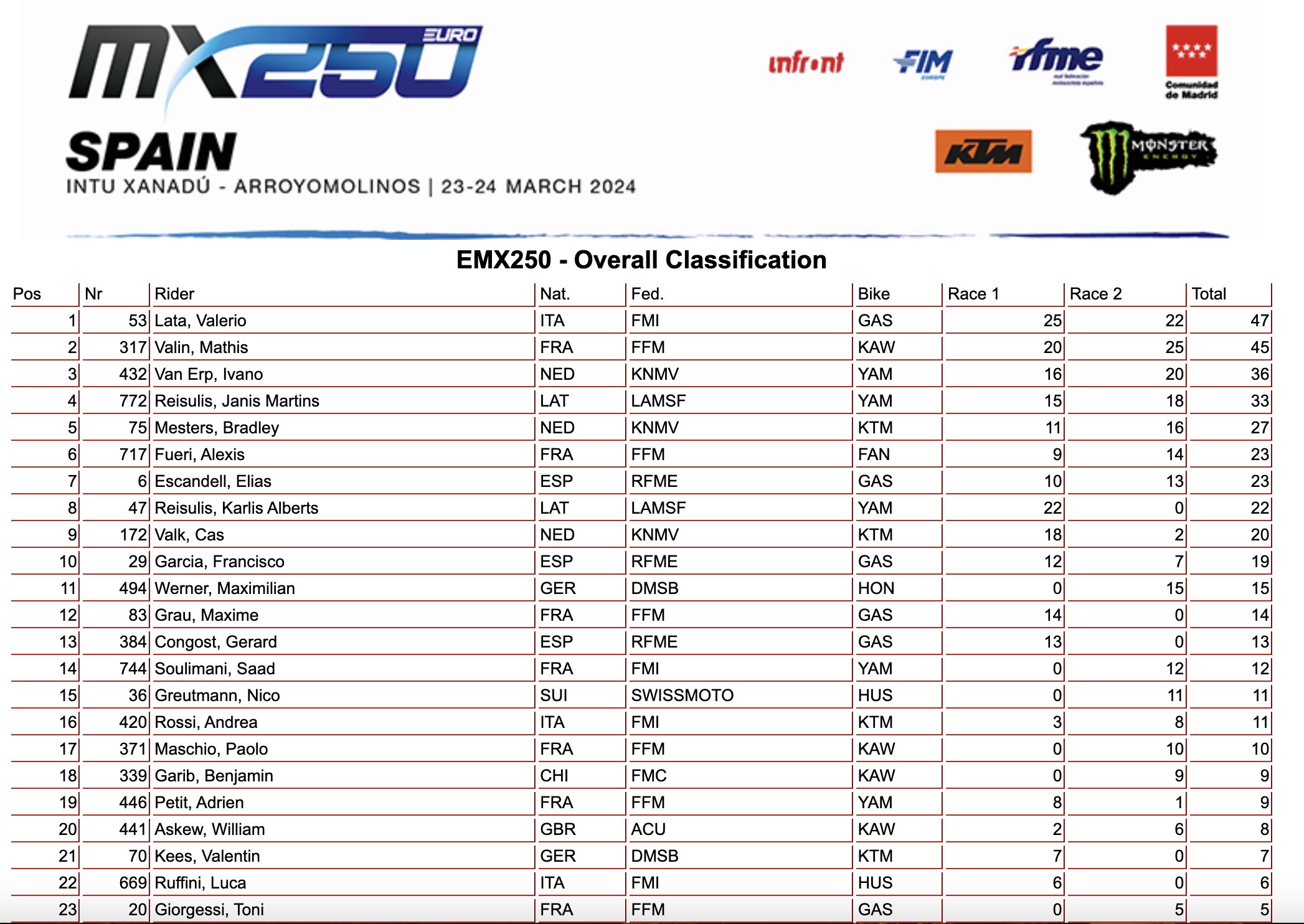 A fargli compagnia sul podio Mathis Valin, che al suo debutto nella categoria si è tolto anche il lusso di vincere gara due, ed Ivano Van Erp che ha sfruttato anche la sfortuna del suo compagno di team Karlis Reisulis appiedato dal suo mezzo in gara due.
